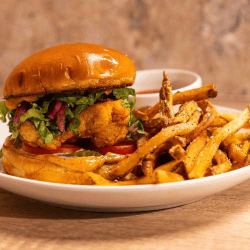 10 oz. house made beef patty sourced from Duma meats, cheddar cheese, crispy onions, house sauce on a brioche bun served with lettuce, tomato, pickle, and house made fries