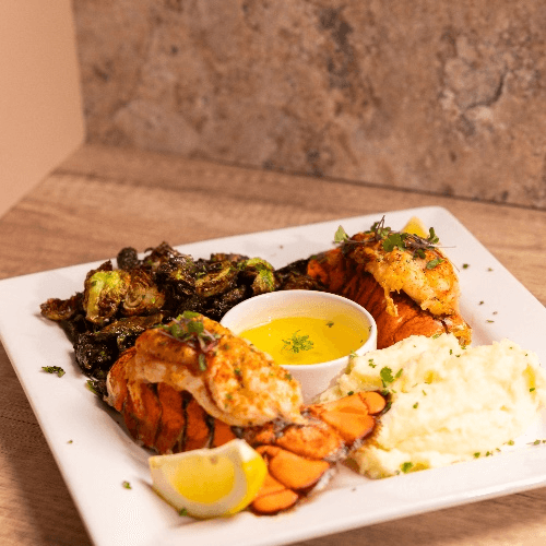 MP. Two 6 oz. cold-water lobster tail, clarified butter, mashed potatoes, brussels sprouts