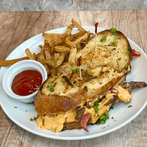 chopped chicken shawarma with a spicy chipotle cream, provolone cheese, sauteed onions & peppers, on grilled Brimfield bread, with house made fries