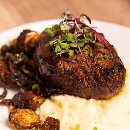 8 oz. filet of beef locall sourced from Duma Meats (no preservatives) , red wine demi glace, mashed potatoes, brussels sprouts