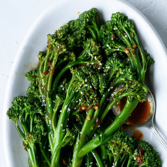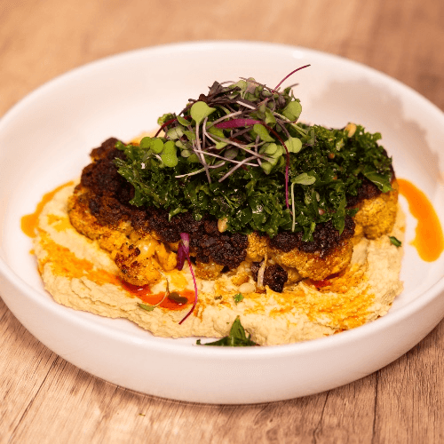 large slice of cauliflower, marinated & seared on the grill, served on a bed of hummus, topped with pine nuts, & herb gremolata (loosely chopped herbs), & micro greens