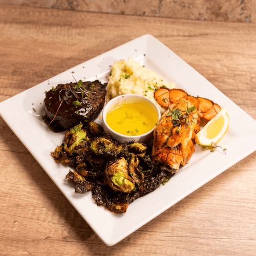 MP. 8 oz. filet of beef, red wine demi glace, 6 oz. cold-water lobster tail, clarified butter, mashed potatoes, brussels sprouts