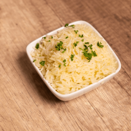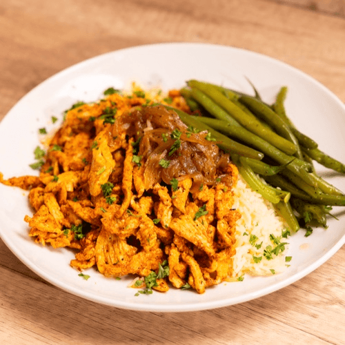 Salt forward traditional preparation with Mediterranean spices, basmati rice, caramelized onions, & sautéed green beans
