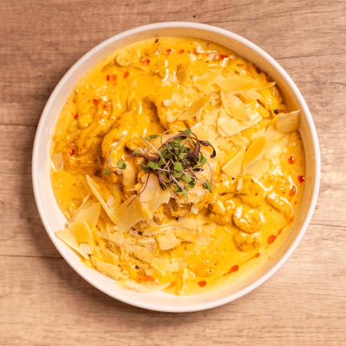 fresh linguine pasta & chicken breast tossed in a house made cream sauce with mediterranean spices & parmesan shavings, & micro greens