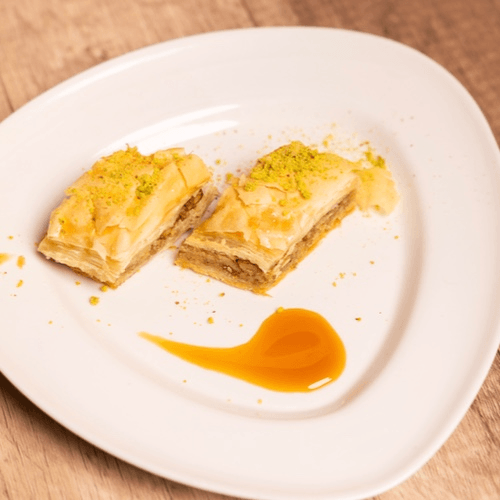 Traditional baklava slices with crunchy phyllo dough, caramel drizzle, & crusted pistachios (Vegan baklava available. Please ask.)