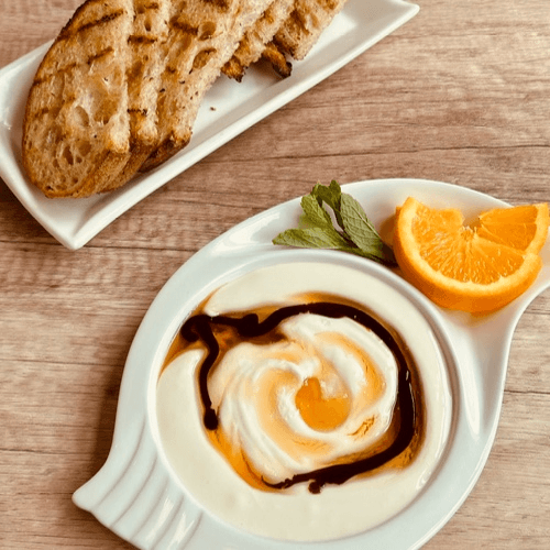 Creamy house made labneh whipped with Maldon sea salt, honey, & a reduced pomegranate vinegar glaze, served with grilled Brimfield sourdough bread
