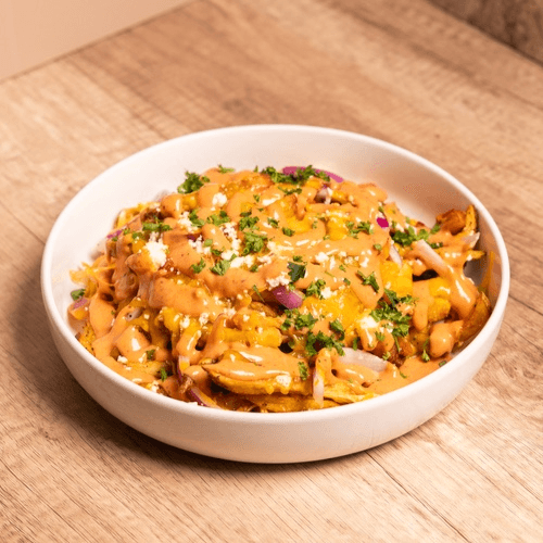 Mediterranean fries with feta, cheddar, peppers, onions, tomato, Laziza sauce, and a za’atar fried egg.