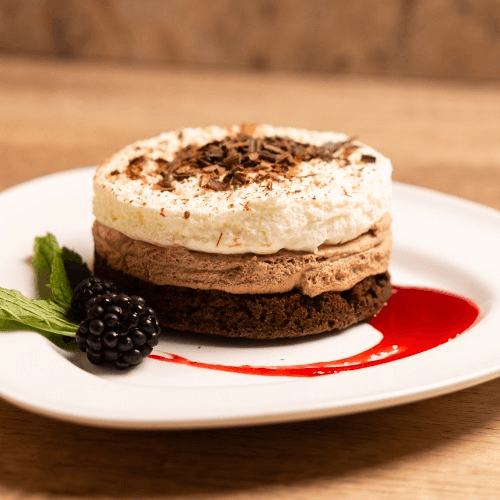 rich brownie crust with layers of milk chocolate & white chocolate ganache, with raspberry coulis (*gluten free)