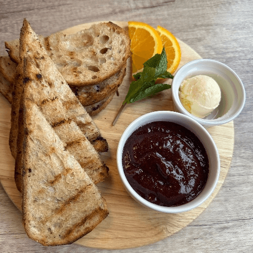 House made jam, sweet dark cherries & vanilla, with orange zest served with whipped butter and grilled Brimfield sourdough bread.