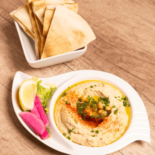 house made hummus with pureed chickpeas, fava beans, garlic, tahini, & lemon juice, garnished with olive oil, paprika, & fresh parsley, served with warm Naan