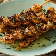 two shrimp skewers grilled with garlic and chimichurri, served with rice and sauteed broccolini